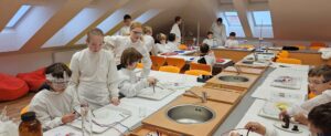 Nejprve je mile přivítal kolektiv v učebně chemie, kde mohli zkusit filtraci a elektrolýzu.