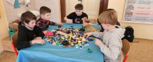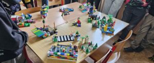 Děti staví z kostiček lega a zároveň přemýšlejí, co by jejich obci pomohlo zlepšit kvalitu života.