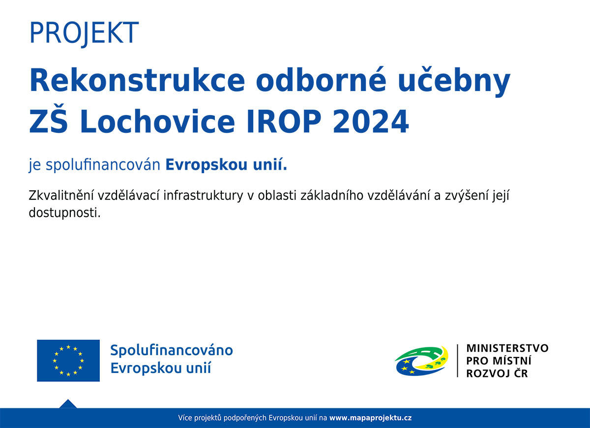 Naše škola realizuje projekt „Rekonstrukce odborné učebny ZŠ Lochovice“, který je spolufinancován Evropskou unií v rámci programu IROP 2024. Cílem projektu je zkvalitnění vzdělávací infrastruktury v oblasti základního vzdělávání a zvýšení její dostupnosti.